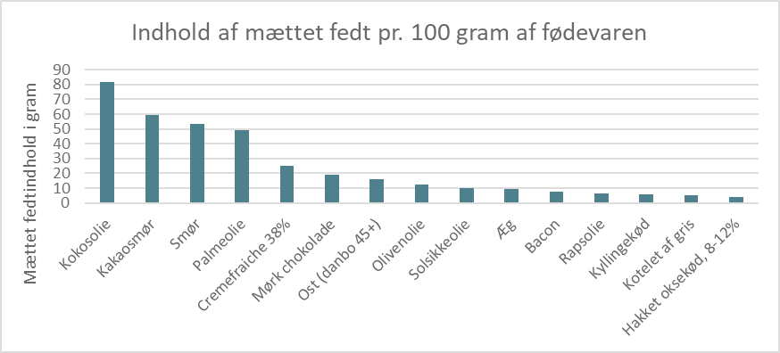 Figur 1 herover viser, hvor mange gram mættet fedt, der findes i forskellige fedtholdige fødevarer pr. 100 gram af fødevaren. Den viser altså den absolutte mængde mættet fedt i en given fødevare. Her er kokosolie, palmeolie, kakaosmør og smør især iøjnefaldende, hvilket viser, at disse fødevarer har et højt indhold af mættet fedt pr. 100 gram. Det er også væsentligt at pointere, at man indtager disse fødevarer i meget forskellige mængder. Derfor vil man f.eks. indtage en større mængde mættet fedt ved at spise en chokoladebar eller en hakkebøf, sammenlignet med et stykke brød med smør.