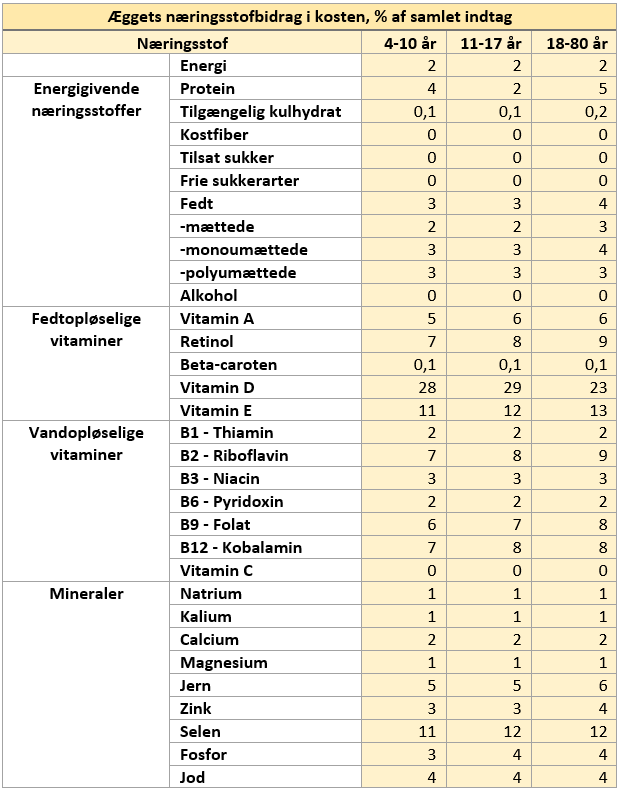 I ”Danskernes Kostvaner 2021-2024” kan man se, hvilke næringsstoffer, æg bidrager med i kosten. Nedenfor kan du se fordelingen i energi og makronæringsstoffer, vitaminer og mineraler.