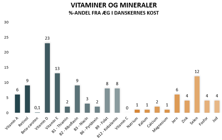 Søjlediagrammet illustrerer ægs gennemsnitsbidrag af vitaminer og mineraler i danskernes kost 2021-2024 for voksne 18-80 årige.