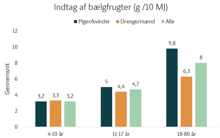 Tallene fra DANSDA 2021-2024 viser, at indtaget af bælgfrugter generelt er meget lavt på tværs af aldersgrupper og køn. I tabellen angives indtag i g /10 MJ. Det har man gjort for at muliggøre sammenligning på tværs af aldersgrupper og køn.