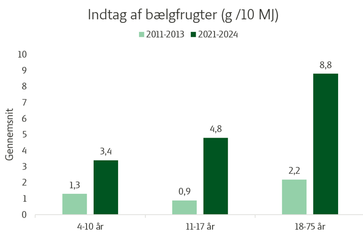 Blandt voksne er indtaget af bælgfrugter steget markant og er næsten firdoblet fra et gennemsnit på 2,2 g /10 MJ i 2011-2013 til 8,8 g /10 MJ i 2021-2024. Også blandt børn og unge ses en stigning, om end fra et meget lavt udgangspunkt. Hos børn i alderen 4-10 år er indtaget øget fra 1,3 til 3,4 g /10 MJ, mens indtaget blandt unge (11-17 år) er steget fra 0,9 til 4,8 g /10 MJ. Udviklingen peger i en positiv retning, men niveauet ligger fortsat langt under anbefalingerne.