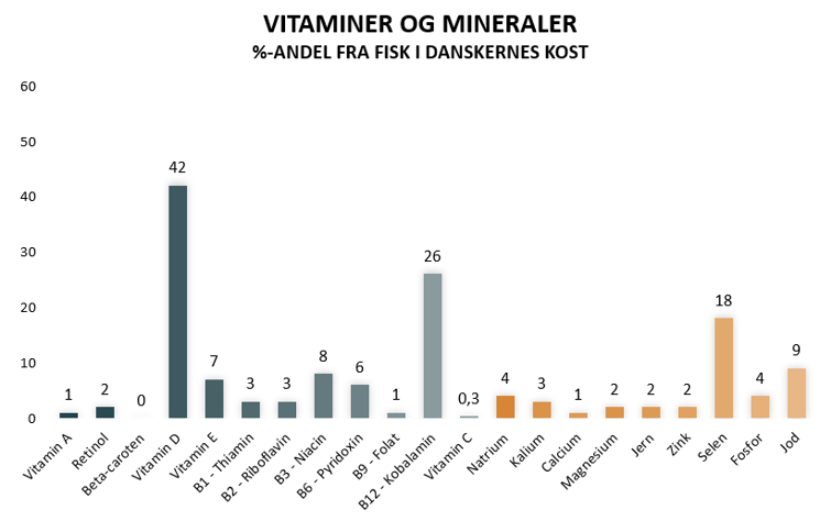 - Jod: Fisk bidrager med 3–9 % af det samlede jodindtag og er dermed en vigtig, men ikke den største kilde. Hovedparten af danskernes jod kommer fra jodberiget salt (31–36 %) samt brød (18–22 %).