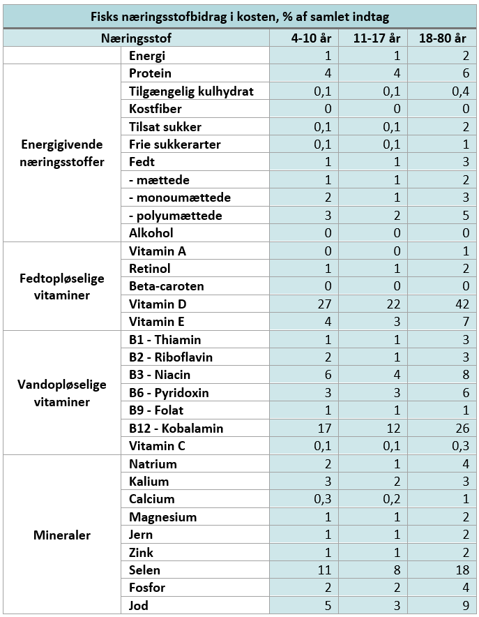 I ”Danskernes Kostvaner 2021-2024” kan man se, hvilke næringsstoffer fisk bidrager med i kosten. Nedenfor kan du se fordelingen i energi og makronæringsstoffer samt vitaminer og mineraler. Tallene er procent af samlet indtag for aldersgruppen for det pågældende næringsstof.