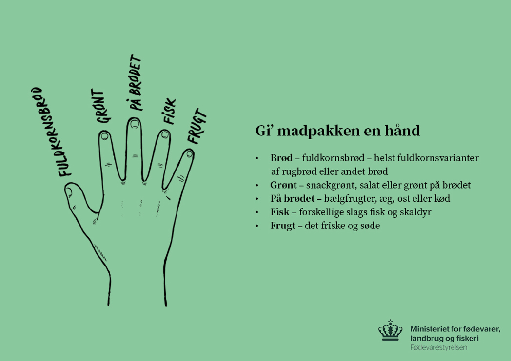 Fødevarestyrelsen har lavet 'Madpakkehånden', som gør det nemmere at huske det hele til madpakken - både når du køber ind, og når den skal laves. Brug blot madpakkehåndens fem fingre til at huske, hvad der er godt at få med i en sund og klimavenlig madpakke:
