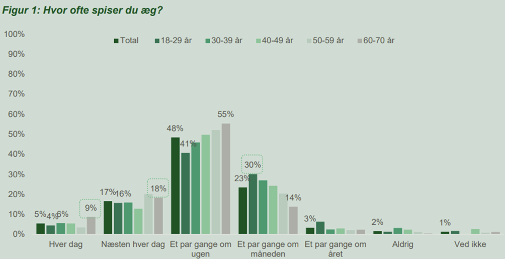 Ifølge DTU Fødevareinstituttet spiser danskerne ca. 17 gram æg om dagen. Et gennemsnitligt æg vejer ca. 56 gram uden skal, hvilket betyder at danskerne får lidt under en tredjedel af et æg om dagen – svarende til 2,3 æg om ugen. I en markedsanalyse som Landbrug & Fødevarer1 i samarbejde med Danske Æg har fået lavet i 2025, fortæller hovedparten af danskerne, at de spiser æg ”et par gange om ugen”. Her ses desuden, at æg oftere spises af de ældste aldersgrupper.
