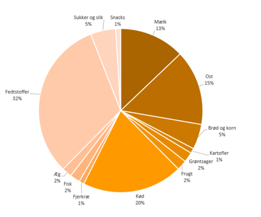 Ifølge rapporten ’Danskernes kostvaner 2011-2013’ kommer 14% af danskernes daglige indtag af energi fra mættet fedt. I cirkeldiagrammet ovenfor ses fra hvilke fødevarer det mættede fedt stammer. Her ses det, at de største bidragsydere til danskernes indtag af mættet fedt er: