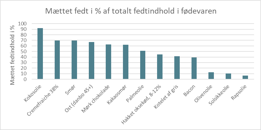 Figur 1 herover viser, hvor mange gram mættet fedt, der findes i forskellige fedtholdige fødevarer pr. 100 gram af fødevaren. Den viser altså den absolutte mængde mættet fedt i en given fødevare. Her er kokosolie, palmeolie, kakaosmør og smør især iøjnefaldende, hvilket viser, at disse fødevarer har et højt indhold af mættet fedt pr. 100 gram. Det er også væsentligt at pointere, at man indtager disse fødevarer i meget forskellige mængder. Derfor vil man f.eks. indtage en større mængde mættet fedt ved at spise en chokoladebar eller en hakkebøf, sammenlignet med et stykke brød med smør.