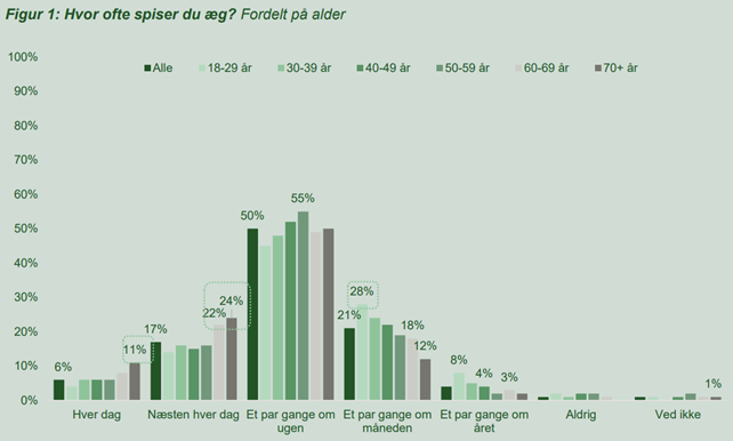 I en markedsanalyse som Landbrug & Fødevarer1 i samarbejde med Danske Æg har lavet i 2026, fortæller hovedparten af danskerne, at de spiser æg ”et par gange om ugen”. Her ses desuden, at æg oftere spises af de ældste aldersgrupper.