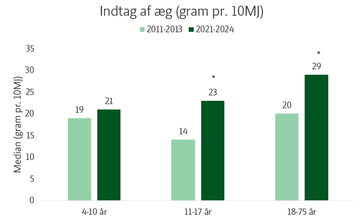 Som det kan ses i diagrammet, er indtaget af æg steget markant de sidste 10 år, særligt blandt unge og voksne, hvor stigningen er signifikant. For voksne er der sket en 42 % stigning, og for unge er det sket en stigning på hele 62 %. Det er særligt de unge piger 11-17 år, som trækker gennemsnittet op her med en 75 % stigning for dem. Samlet peger udviklingen på, at æg er blevet en mere populær og hyppigere anvendt fødevare på tværs af aldersgrupper. Æg spiller således i dag en markant større rolle i kosten end for ti år siden.