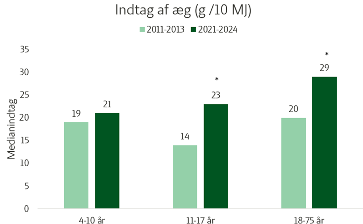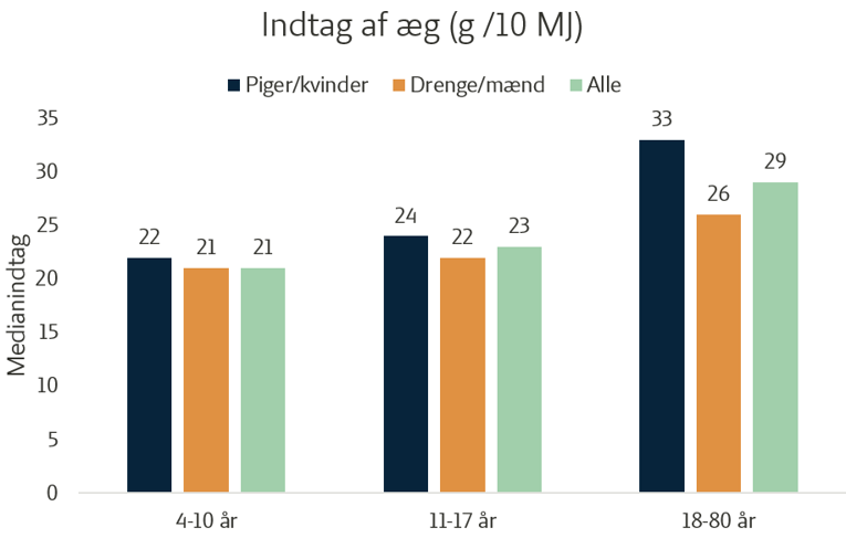 Indtaget er lavest blandt de 4–10‑årige og stiger derefter gradvist. Blandt de 11–17‑årige ligger drengenes medianindtag en smule lavere end pigernes med hhv. 22 og 24 g /10 MJ. Ser man derimod på det gennemsnitlige indtag, har drenge i alderen 11–17 år et højere indtag på 31 g /10 MJ sammenlignet med pigernes 28 g /10 MJ (tal ikke vist). Det peger på, at en mindre gruppe af drengene har et relativt højt indtag af æg, hvilket trækker gennemsnittet op.