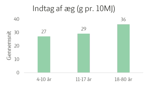 Resultaterne fra DANSDA 2021‑2024 viser, at danskernes faktiske indtag af æg ligger på et niveau, der harmonerer godt med denne anbefaling. Det gennemsnitlige indtag blandt voksne er 36 gram pr. 10MJ, hvilket svarer til omtrent et halvt æg dagligt – eller cirka fire æg om ugen. Dermed ligger de fleste voksne inden for det, der i praksis er en passende mængde i forhold til kostrådenes formuleringer. Blandt børn er indtaget lavere: 4‑10‑årige ligger omkring 27 gram pr. 10MJ, mens 11‑17‑årige ligger på 29 gram pr. 10MJ i gennemsnit.
