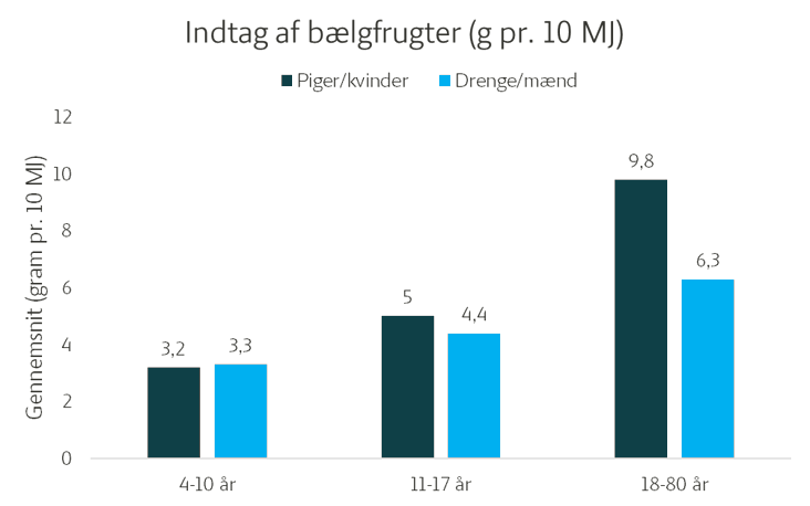 Der ses kun små kønsforskelle blandt børn og unge, mens voksne kvinder spiser mere end voksne mænd (9,8 g/10MJ vs. 6,3 g/10MJ). Derudover viser undersøgelsen, at over halvdelen af danskerne ikke spiser bælgfrugter i løbet af en uge.