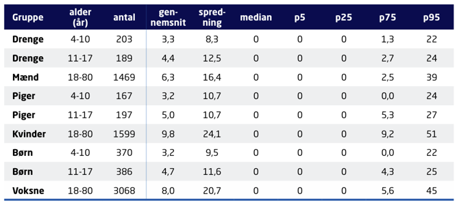 DANSDA 2021-2024 viser, at indtaget af bælgfrugter er meget skævt fordelt i befolkningen. Medianen er 0 g/10MJ for alle alders- og kønsgrupper, hvilket betyder, at over halvdelen slet ikke spiser bælgfrugter i løbet af en uge. Ved at kigge på percentilerne, kan man opdele befolkningen i, hvem der har et lavt, middel eller højt indtag.