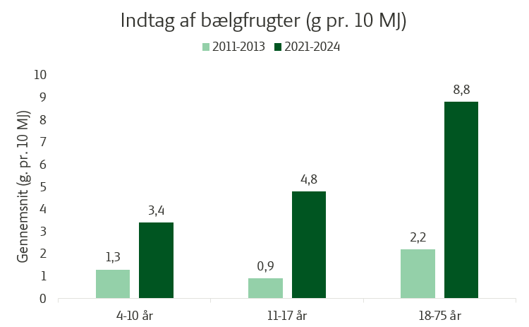Hos de voksne ses en stigning som er firdoblet, og som går fra et gennemsnitligt indtag på 2,2 g/10 MJ (2011-2013) til 8,8 g/MJ (2021-2024). Hos børn (4-10 år) ses en stigning på 1,3 g/10 MJ til 3,4 g/10 MJ, og hos de unge (11-17) ses en stigning på 0,9 g/10 MJ til 4,8 g/10 MJ. Der er altså sket en positiv udvikling i indtaget af bælgfrugter, men der er stadig lang vej endnu.