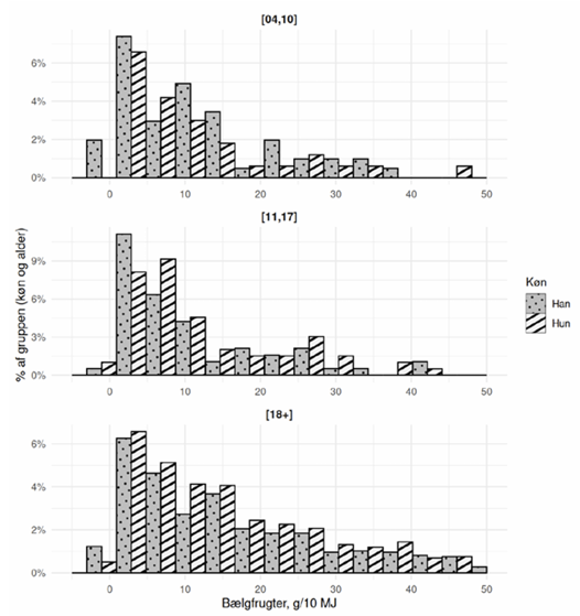 Diagrammet her viser, hvordan indtaget af bælgfrugter fordeler sig i befolkningen på tværs af tre aldersgrupper og fordelt på køn. For hver aldersgruppe illustrerer søjlerne, hvor stor en andel der ligger på forskellige niveauer af indtag af bælgfrugter (g/10 MJ). På tværs af alle grupper ses en bred variation i indtaget, men de fleste ligger i de lavere intervaller, mens kun få har et moderat eller højt indtag. Diagrammet giver dermed et visuelt overblik over både spredningen og forskellene mellem drenge/mænd og piger/kvinder i hver aldersgruppe.