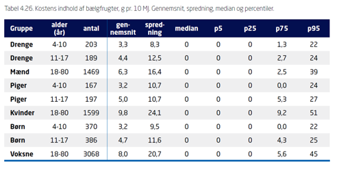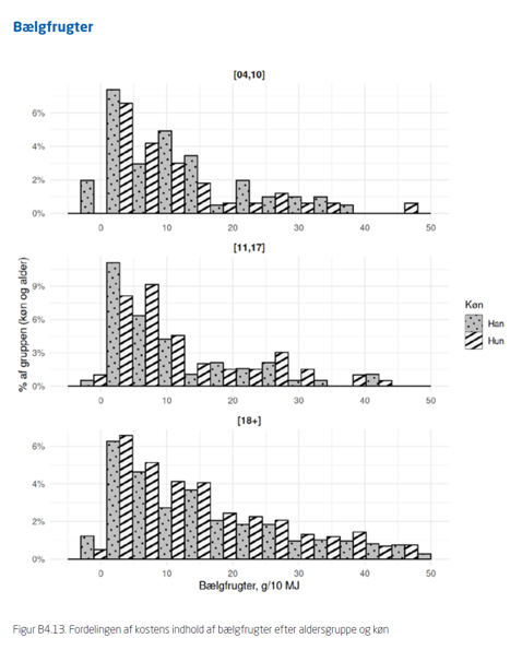 I denne gruppe indgår bælgfrugter altså ikke i kosten. Dette er gældende for alle aldersgrupper og begge køn.