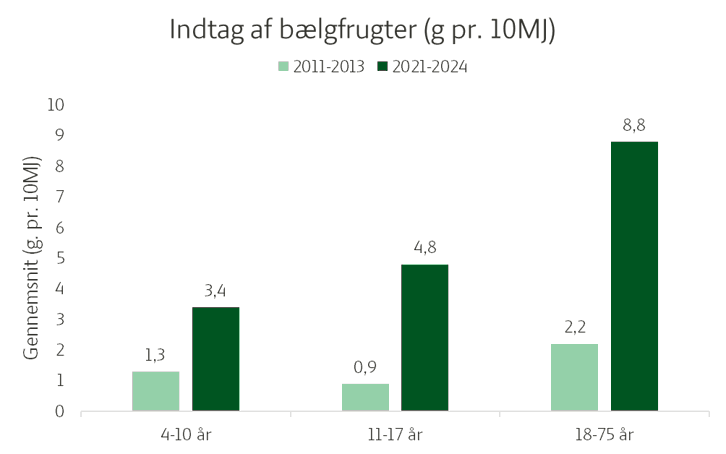 Hos de voksne ses en stigning som er firdoblet, og som går fra et gennemsnitligt indtag på 2,2 g/10 MJ (2011-2013) til 8,8 g/MJ (2021-2024). Hos børn (4-10 år) ses en stigning på 1,3 g/10 MJ til 3,4 g/10 MJ, og hos de unge (11-17) ses en stigning på 0,9 g/10 MJ til 4,8 g/10 MJ. Der er altså sket en positiv udvikling i indtaget af bælgfrugter, men der er stadig lang vej endnu.