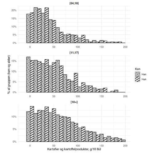 Denne gruppe har det højeste indtag af kartofler. Se fordelingen af indtaget i aldersgrupperne herunder: