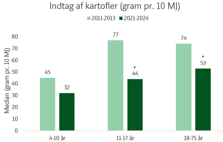 Som det fremgår af diagrammet, er indtaget af kartofler faldet markant siden den forrige kostundersøgelse i 2011-2013. Faldet i kartoffelindtaget er statistisk signifikant for voksne mænd og kvinder (18-75 år), unge drenge og piger (11-17 år) samt for piger (4-10 år). For drenge (4-10 år) er faldet derimod ikke signifikant, og samlet vurderes faldet for aldersgruppen 4-10 år derfor ikke som signifikant. Samlet ses der altså et tydeligt fald i indtaget af kartofler på tværs af alle aldersgrupper og køn. Det indikerer, at kartofler generelt fylder mindre i danskernes kost i dag end for 10 år siden.