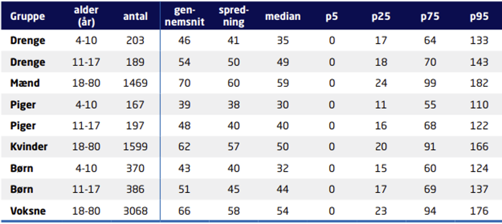 - Voksne 18-80 år: 54 g. pr. 10 MJ