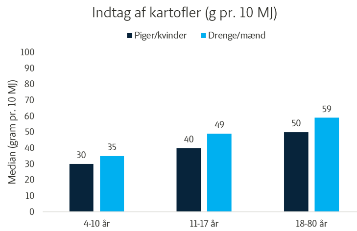 De voksne ligger højere i kartoffelindtaget end både børn og unge, når vi ser på medianforbruget. Derudover viser tallene, at drenge/mænd har en højere median for kartoffelindtag end piger/kvinder på tværs af aldre. Blandt de 4‑10‑årige ligger drengenes median på 35 g. pr. 10 MJ, mens pigerne ligger på 30 g. pr. 10 MJ. Hos de 11‑17‑årige er medianen 49 g. pr. 10 MJ for drenge og 40 g. pr. 10 MJ for piger. For de voksne er mændenes median 59 g. pr. 10 MJ, og kvindernes 50 g. pr. 10 MJ – forskellene er dog relativt små. Samlet set indtager både børn, unge og voksne mindre end én middelstor kartoffel om dagen.