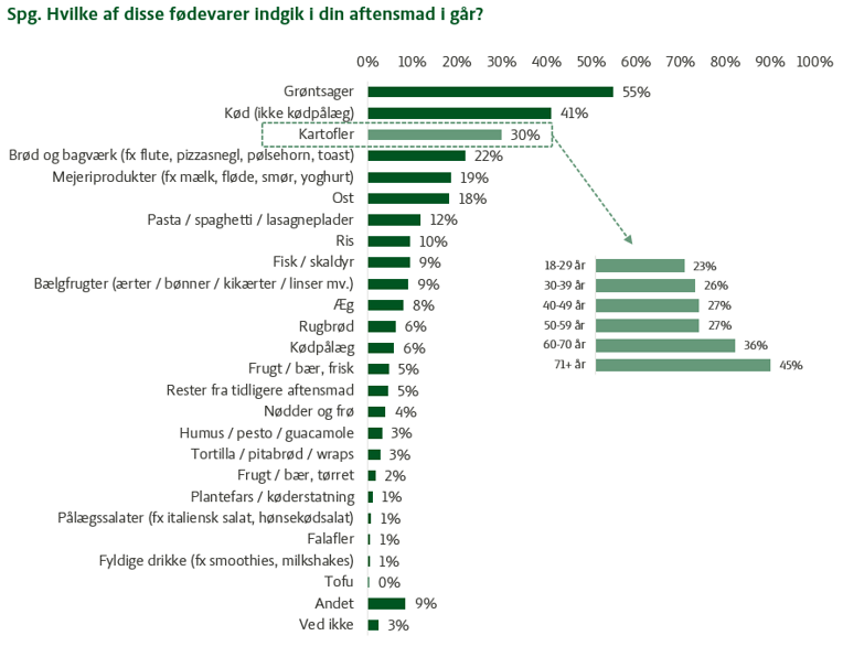 I en markedsanalyse om kartofler udarbejdet af Landbrug & Fødevarer, fremgår det, at kartoflen er at finde på tre ud af ti aftensmadstallerkener, og at det især er danskere over 60 år, der har kartoflen som en foretrukken spise.