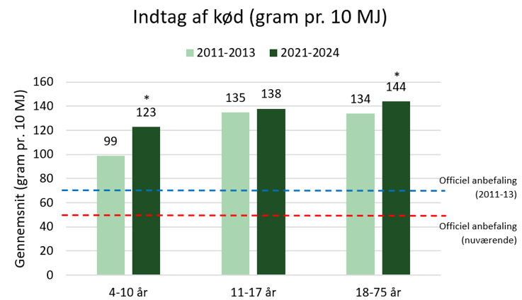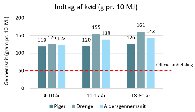 Ifølge Danskernes Kostvaner 2021-2024 spiser børn i alderen 4-10 år i gennemsnit 123 g tilberedt kød /10 MJ. Børn i alderen 11-17 år spiser gennemsnitligt 138 gram tilberedt kød /10 MJ, mens voksne i alderen 18-80 år spiser 143 g /10 MJ. Det er væsentligt mere end anbefalingerne angiver på op til 50 g /10 MJ, markeret i diagrammet med den røde vandrette stiplede linje, eller 350 g om ugen.