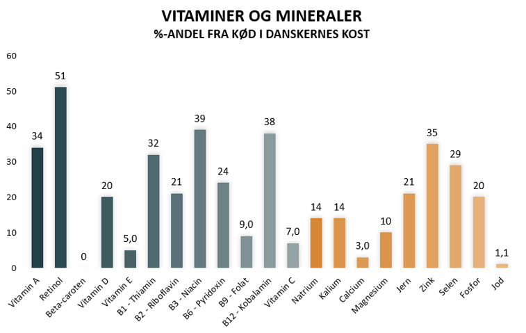 Det er især vitaminerne A, B6 og B12 samt mineralerne jern, zink og selen, som vi får fra kødet. Rødt kød er den største kilde til vitamin A (retinol), vitamin B12, jern, zink men også cholin, selvom det ikke indgår i danskernes kostvaneundersøgelse.