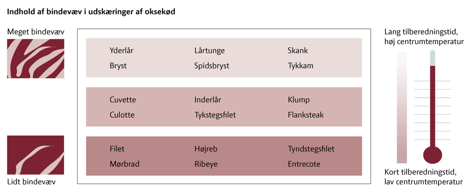 I figuren herunder ses sammenhængen mellem udskæring, bindevæv og tilberedning. Jo mere bindevæv, jo længere tilberedningstid og jo højere centrumtemperatur.