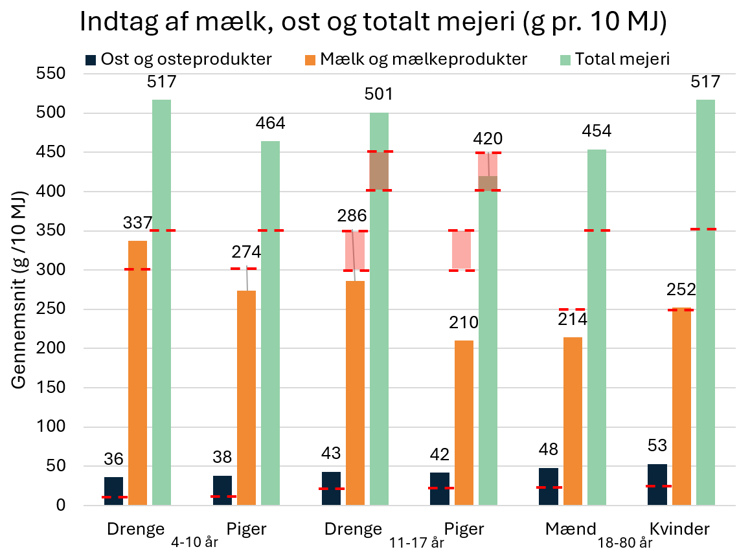 - Hos de 4‑10‑årige ligger osteindtaget på 33 g dagligt, hvilket ligger over anbefalingen på 10 g ost. Selv blandt de 20 % med det laveste indtag ligger niveauet omkring, eller over, anbefalingen med op mod 19 g /10 MJ. Indtaget af mælk- og mælkeproduktindtag ligger på 271 ml, hvilket er under anbefalingen på 300 ml. Når ost og mælk samles, ender det totale mejeriindtag på 421 ml, hvilket ligger betydeligt over den anbefalede totale mængde på 350 ml. Særligt drengene i denne aldersgruppe skiller sig ud med et markant højere indtag end anbefalet.